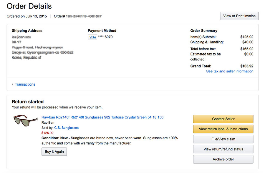 선그라스 구입비 $125.92+제가 반송할때 들었던 $23.57 = $149.49를 반환 하겠답니다.