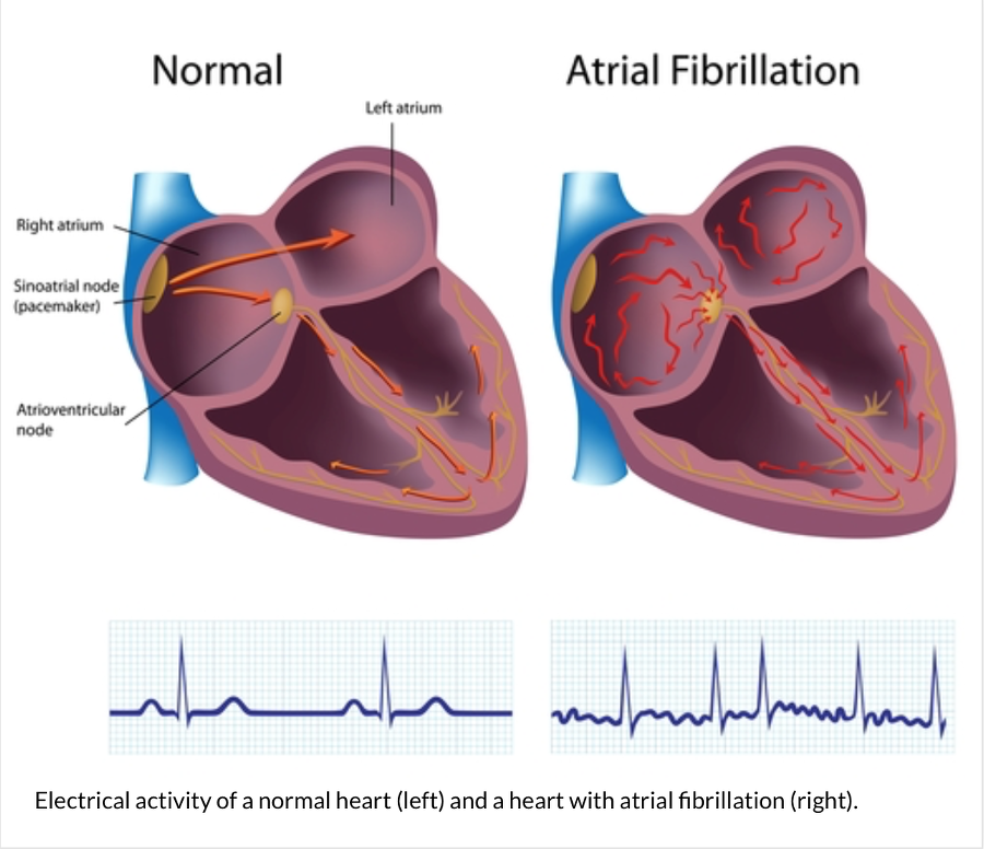 심장이 규칙적으로 뛰지를 못하고 바르르 떨리는 탓에 혈전이 생기고, 이 혈전이 뇌속의 실핏줄을 막아 뇌졸증 걸리는 확률이