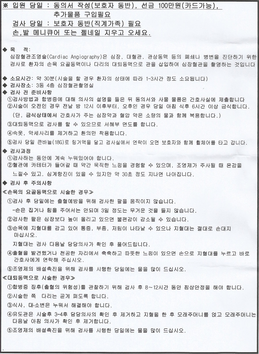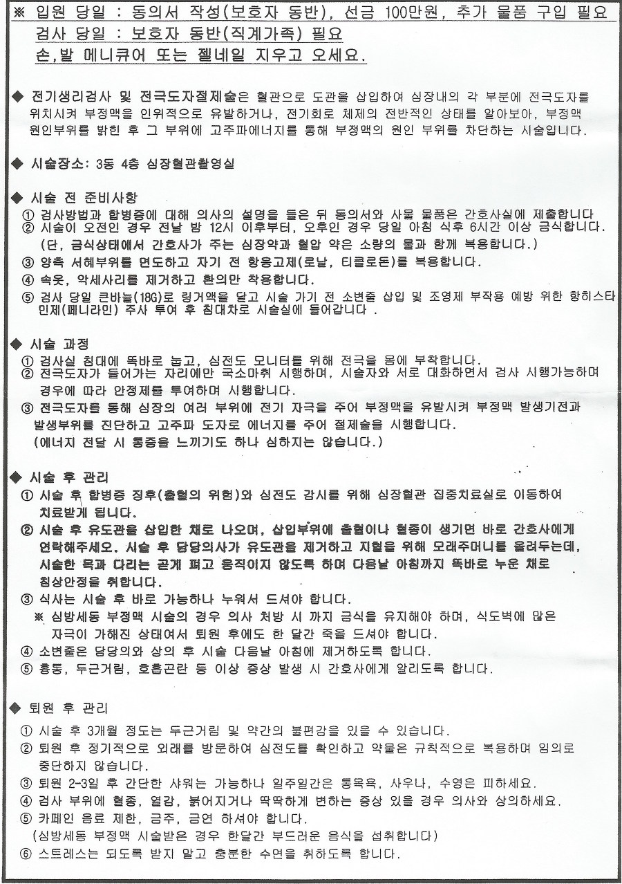 위 “심장혈관 조영술” 과 “전기 생리 검사&전극도자 절제술” 이 두가지의 검사와 시술을 동시에 한다고 합니다.
