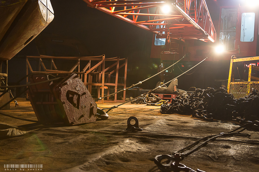 오늘 밤 12시에 출항 하기 위해 빡센 하루를 마친 한 직원이 팔레트 위에 고단한 몸을 뉘고 쉬고 있습니다.