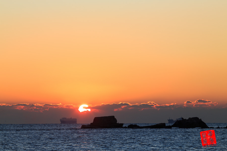 이유는, 멀리 큰 배가 모자섬 끝바리 礖(여)와 거의 겹쳐져 구도가 일출 각이 안나오게 끔 잡혀 한곳으로 몰려 들 계시던데요.ㅎ
