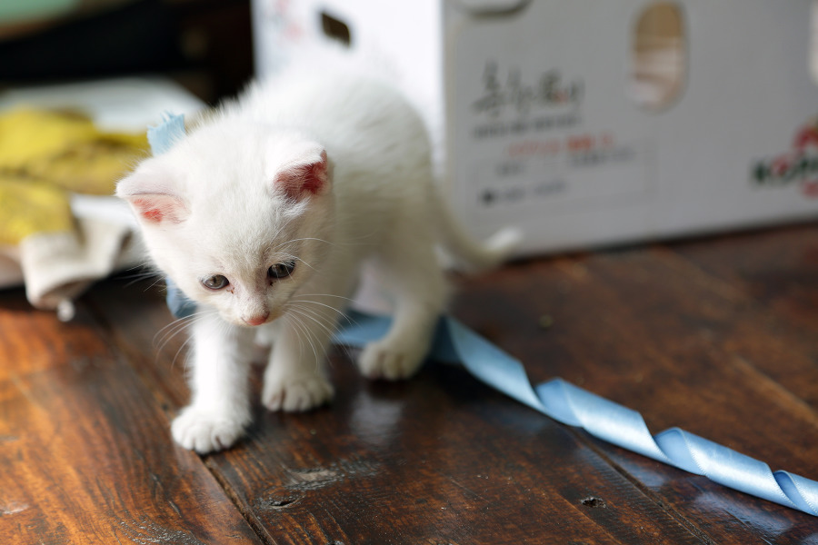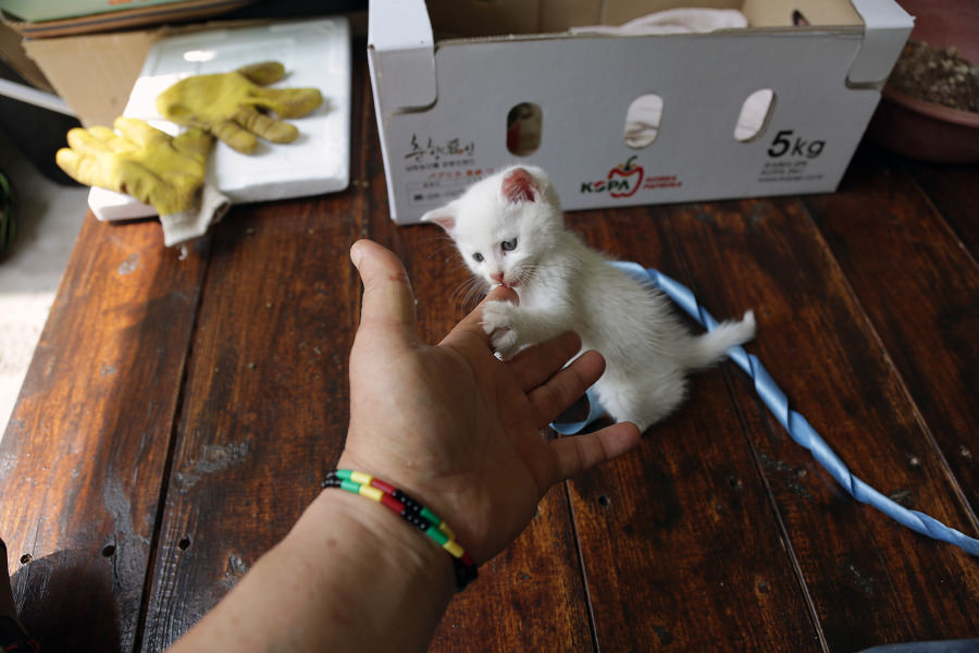 시골인데, 평상 마루에 새끼 고양이 한마리가 있네요.