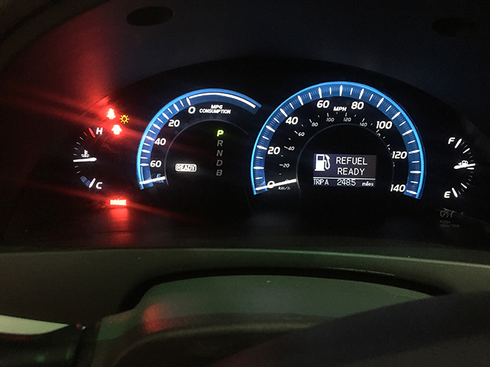 사진을 보시면 경고등은 들어 왔지만, 유량계 바늘은 바닥을 치지 않은것을 볼수 있는데요.