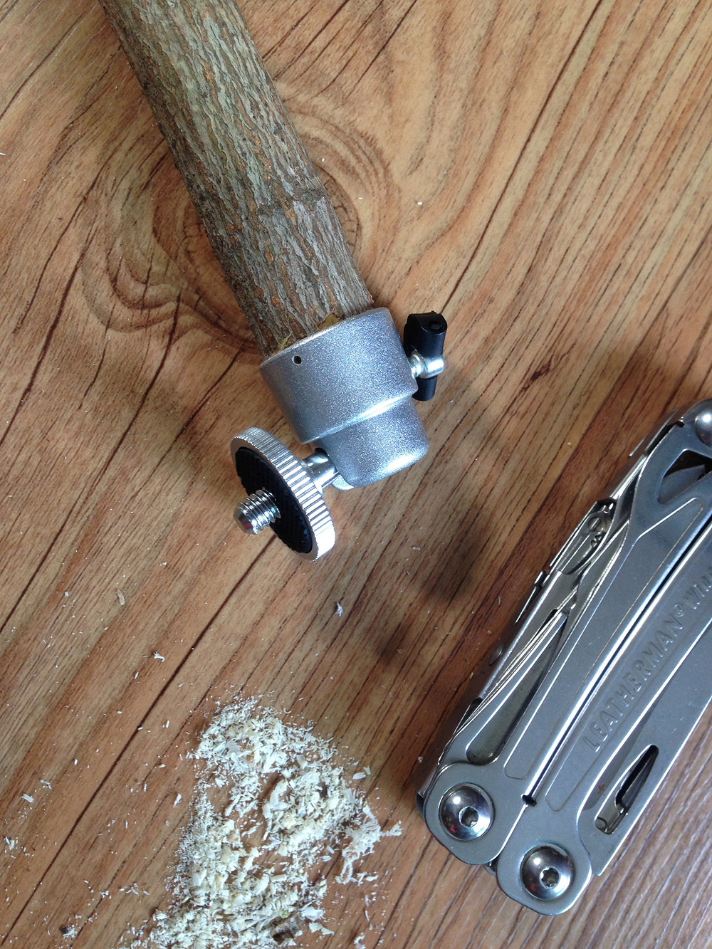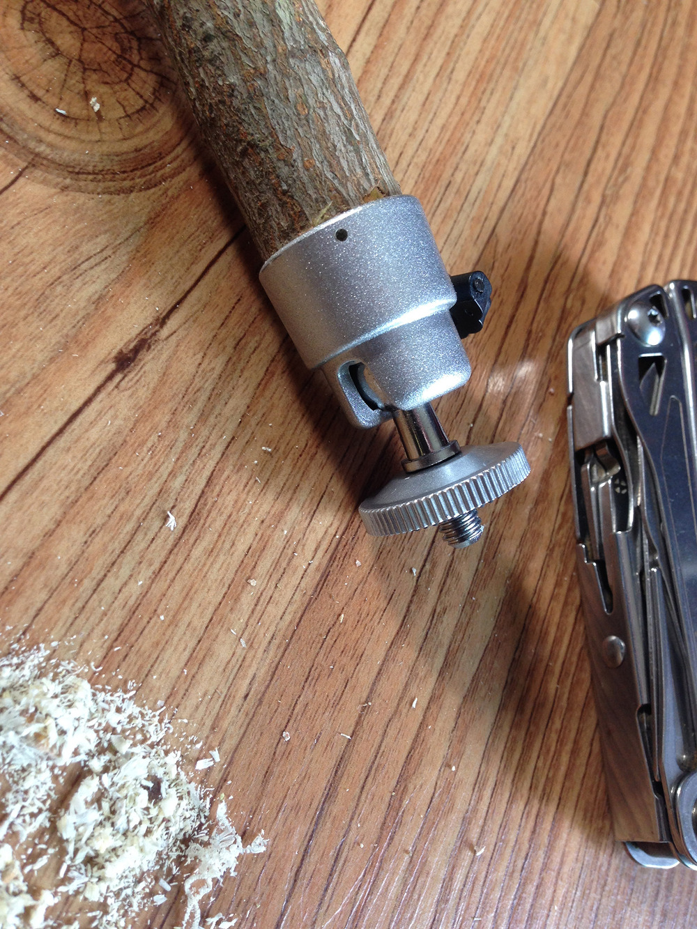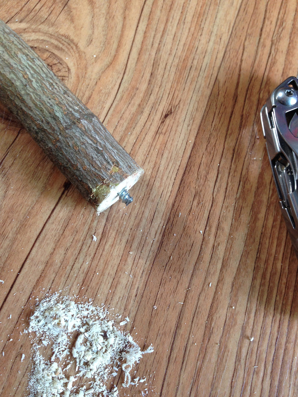 나무 지팡이에 드릴로 구멍을 뚫고 그 구멍에 맞는 나사를 박아넣고 (나사 대가릴 짜르고 난 후..)