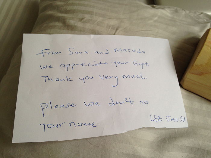 그래서 숙소로 들어오니 사라라는 이름의 메이드가 고맙다고 메모를 적어서 제 침대 베게위에 올려 놨더군요.