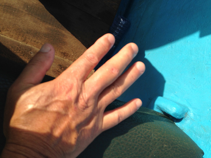 작업을 다 마치고 바지위에 올라와 장갑을 벗어보니 약간 째지고 손가락이 띵띵 부어 있네요.