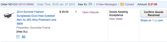 전 달 1월27일 알리에 주문했던 선글라스가 제 손에 들어 왔습니다.