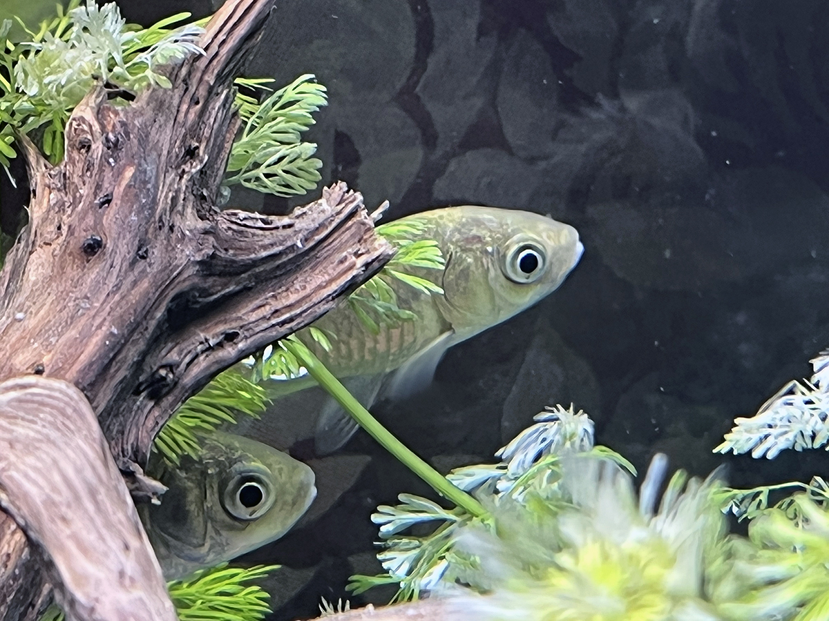 작은가시고기 세마리가 들어있던 어항에서 경쟁에서 탈락해 꼬리가 뜯겨나간 작은가시고기 한마리도 있습니다.